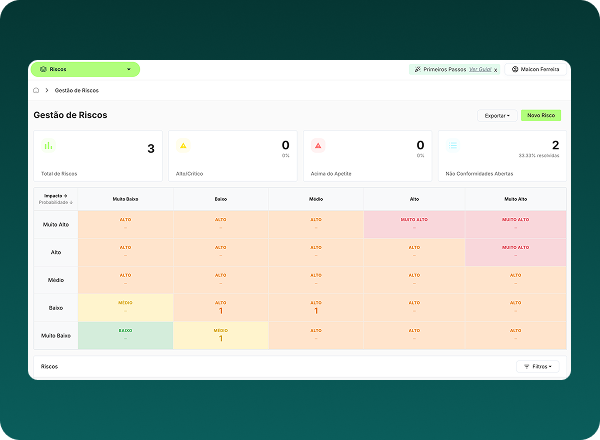 Centralize e automatize Governança, Riscos e Compliance em uma única plataforma. Gerencie riscos, políticas corporativas, due diligence de fornecedores e conduta ética — com visibilidade em tempo real.